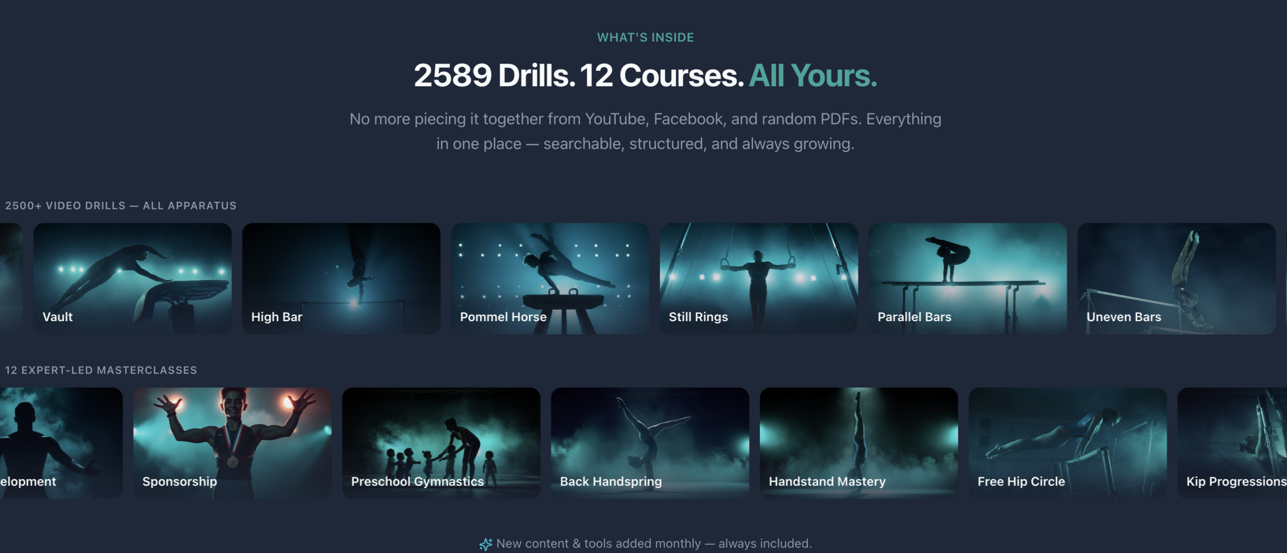 New content is added to the platform every month. The Gymnastics Tools content team works together with experienced coaches and experts to continuously expand the platform with: